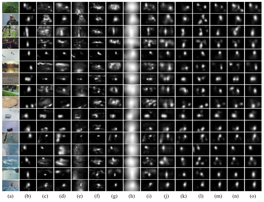 Representative frames of state-of-the-art models on AVS1K. (a) Video frame, (b) Ground truth, (c) HFT, (d) SP, (e) PNSP, (f) SSD, (g) LDS, (h) eDN, (i) iSEEL, (j) SalNet, (k) DVA, (l) STS, (m) MM-Net, (n) MM-Net-, (o) MM-Net+.