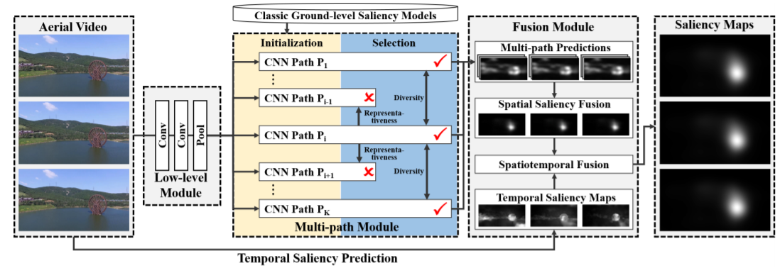 As an emerging vision platform, a drone can look from many abnormal viewpoints which brings many new challenges into the classic vision task of video saliency prediction.To investigate these challenges, this paper proposes a large-scale video dataset for aerial saliency prediction, which consists of ground-truth salient object regions of 1,000 aerial videos,annotated by 24 subjects. To the best of our knowledge, it is the first large-scale video dataset that focuses on visual saliency prediction on drones. Based on this dataset, we propose a Model-guided Multi-path Network (MM-Net) that serves as a baseline model for aerial video saliency prediction. Inspired by the annotation process in eye-tracking experiments, MM-Net adopts multiple information paths, each of which is initialized under the guidance of a classic saliency model. After that, the visual saliency knowledge encoded in the most representative paths is selected and aggregated to improve the capability of MM-Net in predicting spatial saliency in aerial scenarios. Finally, these spatial predictions are adaptively combined with the temporal saliency predictions via a spatiotemporal optimization algorithm. Experimental results show that MM-Net outperforms ten state-of-the-art models in predicting aerial video saliency.