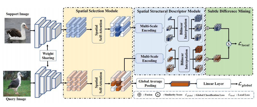 Few-shot learning aims to recognize the novel categories from a few examples. However, most of the existing approaches usually focus on general image classification and fail to handle subtle differences between images. To alleviate this issue, we propose a trilinear spatial-awareness network for fewshot-grained visual recognition, called S3Net, which is composed of a spatial selection module, structural pyramid descriptor, and subtle difference mining module. Specifically,we first build the global relation to strengthen the features by spatial selection module. The structural pyramid descriptor then constructs a multi-scale representation for enhancing the rich contextual information by exploiting different receptive fields in the same feature layer. Furthermore, a similarity loss based on local descriptors and a global classification loss is design to help the network learn discrimination capability by handling subtle differences in confused or near-duplicated samples. Extensive experiments on 4 few-shot fine-grained benchmarks demonstrate that our proposed approach is effective and outperforms state-of-the-art models by large margins.