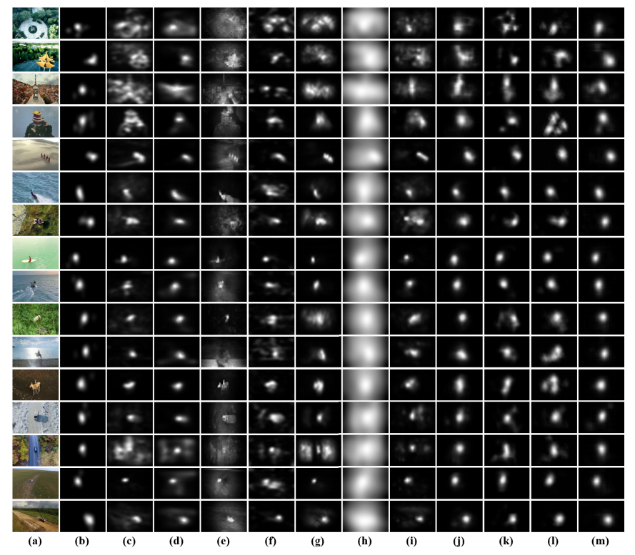 Representative frames of the models on AVS1K. (a) Video frame, (b) Ground truth, (c) HFT, (d) SP, (e) PNSP, (f) SSD, (g) LDS, (h) eDN, (i) iSEEL,(j) DVA, (k) SalNet, (l) STS, (m) SKD.