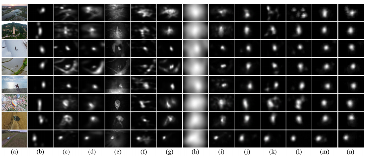 Representative frames of state-of-the-art models on AVS1K. (a) Video frame, (b) Ground truth, (c) HFT, (d) SP, (e)PNSP, (f) SSD, (g) LDS, (h) eDN, (i) iSEEL, (j) DVA, (k) SalNet, (l) STS, (m) UVA-DVA-32, (n) UVA-DVA-64.